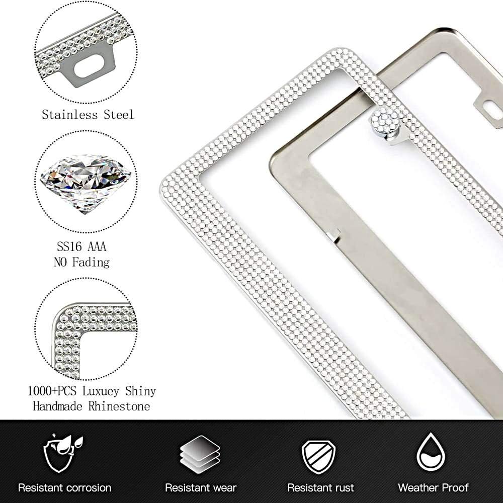 3,High Quality Stainless Steel Frame: These bling gem license plate frames use special mixed waterproof glue to secure the crystal not to fall. Made of high-quality stainless steel, chrome mirror polished, no worry about fading and rust, it can be easy to cooperate with any paint job.